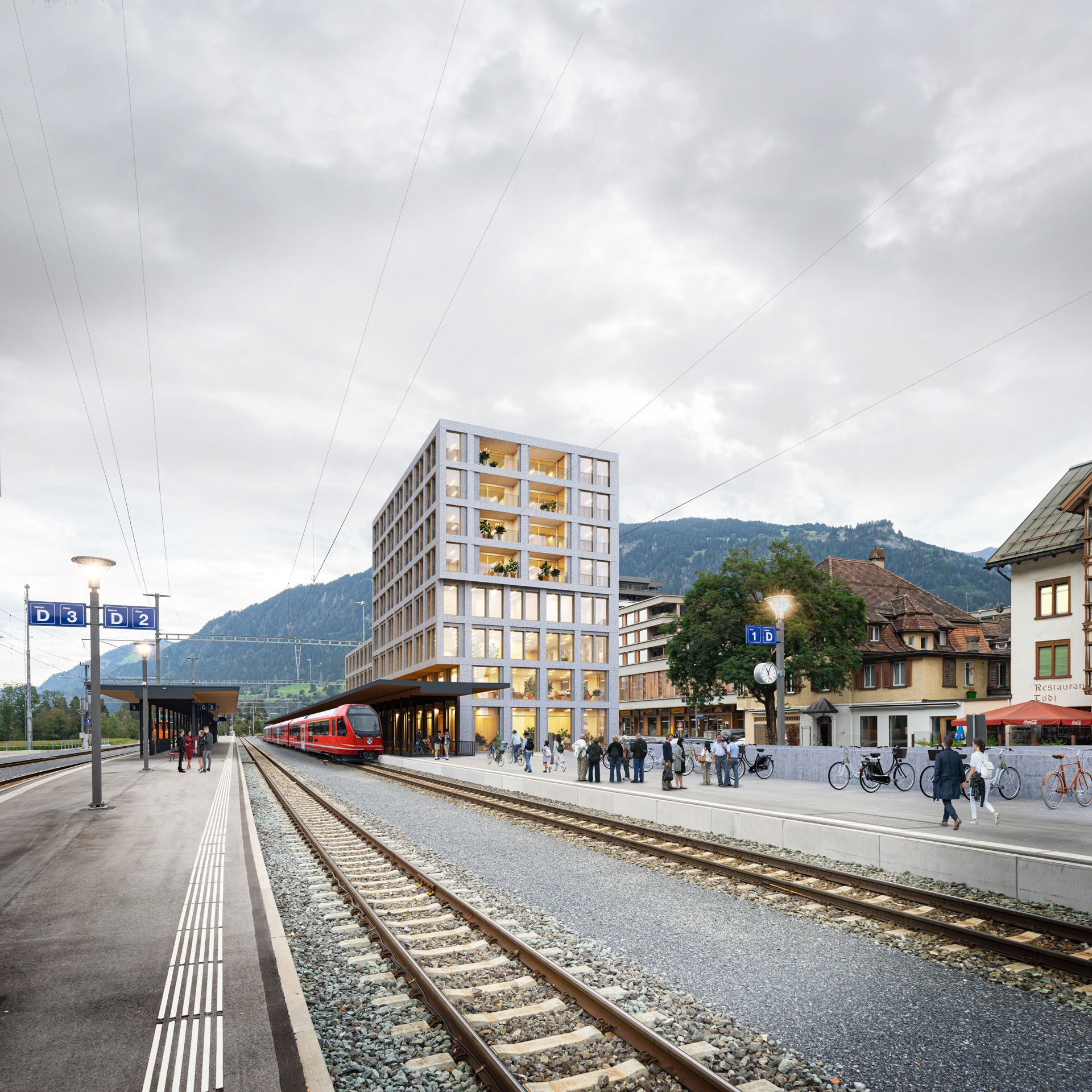 Voraussichtlich per Herbst 2027 wird in Ilanz das neue Bahnhofsgebäude bezogen. Es soll ein attraktives Geschäfts- und Wohnhaus mit multifunktionalen Nutzungen werden, in dem auch verschiedenste Dienstleistungen und Waren angeboten werden, Ausbildung stattfindet und an zentralster Lage gewohnt wird. Die zwei in der Höhe leicht versetzten, aneinandergestellten Kuben haben eine klare Nutzungsverteilung.